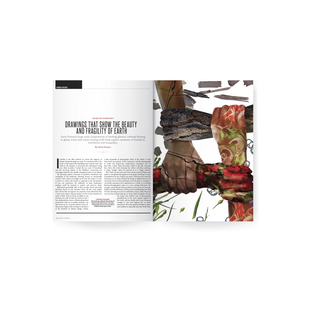 This work was created based off of a Ted Talk called “Zaria Forman: Drawings that show the beauty and fragility of Earth @ TED Talks Live”- the idea from this was to create a magazine spread that utilized metaphors to showcase the meaning of the ted talk.
